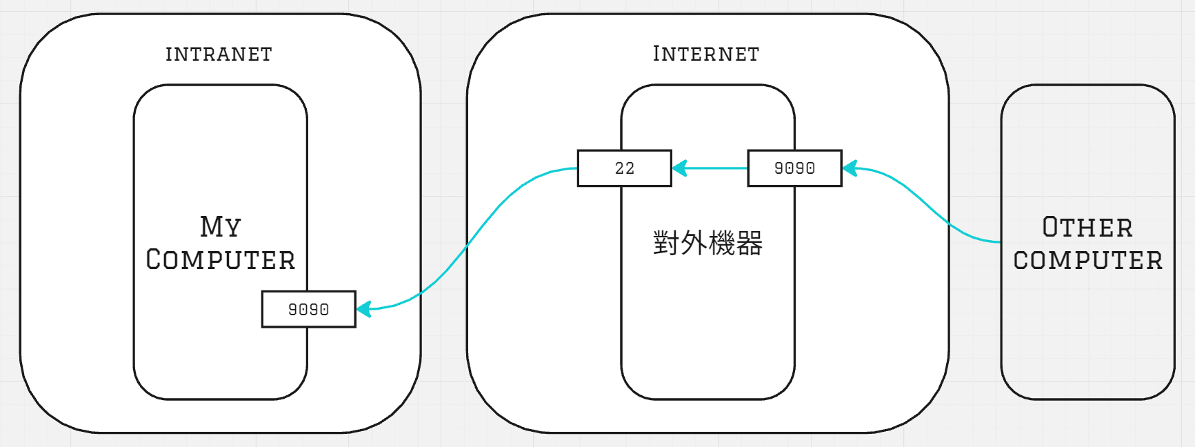 即在 client 上開啟 9090 port 等待連線,當有人連上時,將所有的資料送到 remote-server:8080,也就是將 request 導向 server 上。